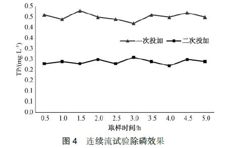 連續流試驗時采用如圖3所示流程,選擇污水除磷劑投加量為90mg/L,討論一次投加與二次投加方式的除磷效果。一.次投加時,在混合池中一次性投加除磷劑;二次投加時,次投加在混合池,第二次投加在反應池?;旌铣財嚢杷俣燃s為300r/min,在混合池反應30~40s后進入反應池,反應池攪拌速度為150 r/min,反應約5min后,進入沉淀池,經20~25min流至出水口。每30min取出水進行指標檢測,磷去除效果如圖4所示。試驗發現,初始TP為5mg/L,二次投加除磷劑時,出水TP可以穩定達到地表水IV類標準,且出水TP明顯低于一次投加,這與靜態試驗結果相符。二次投加時磷去除率比一次投加增加了約4%,因此選擇二次投加除磷劑的方式是可行的,實際工程中可選擇使用兩組計量泵恒量投加除磷劑的方式。投加除磷劑后,出水濁度從2.63NTU降低至0.99NTU,去除率達到了62.4%,但是對水中COD卻無明顯去除效果,分析原因為校園的水中COD為溶解性COD,通過化學混凝的方法對其無去除作用。